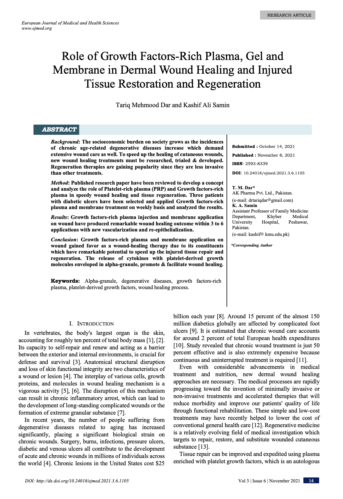 S. Bano and T. M. Dar “Role of Growth Factors-rich Plasma (Activated Platelet-rich Plasma) in Androgenic Alopecia: Literature Review and Suggested Treatment Protocol,” European Journal of Medical and Health Sciences 3(1): 16-23, 2021