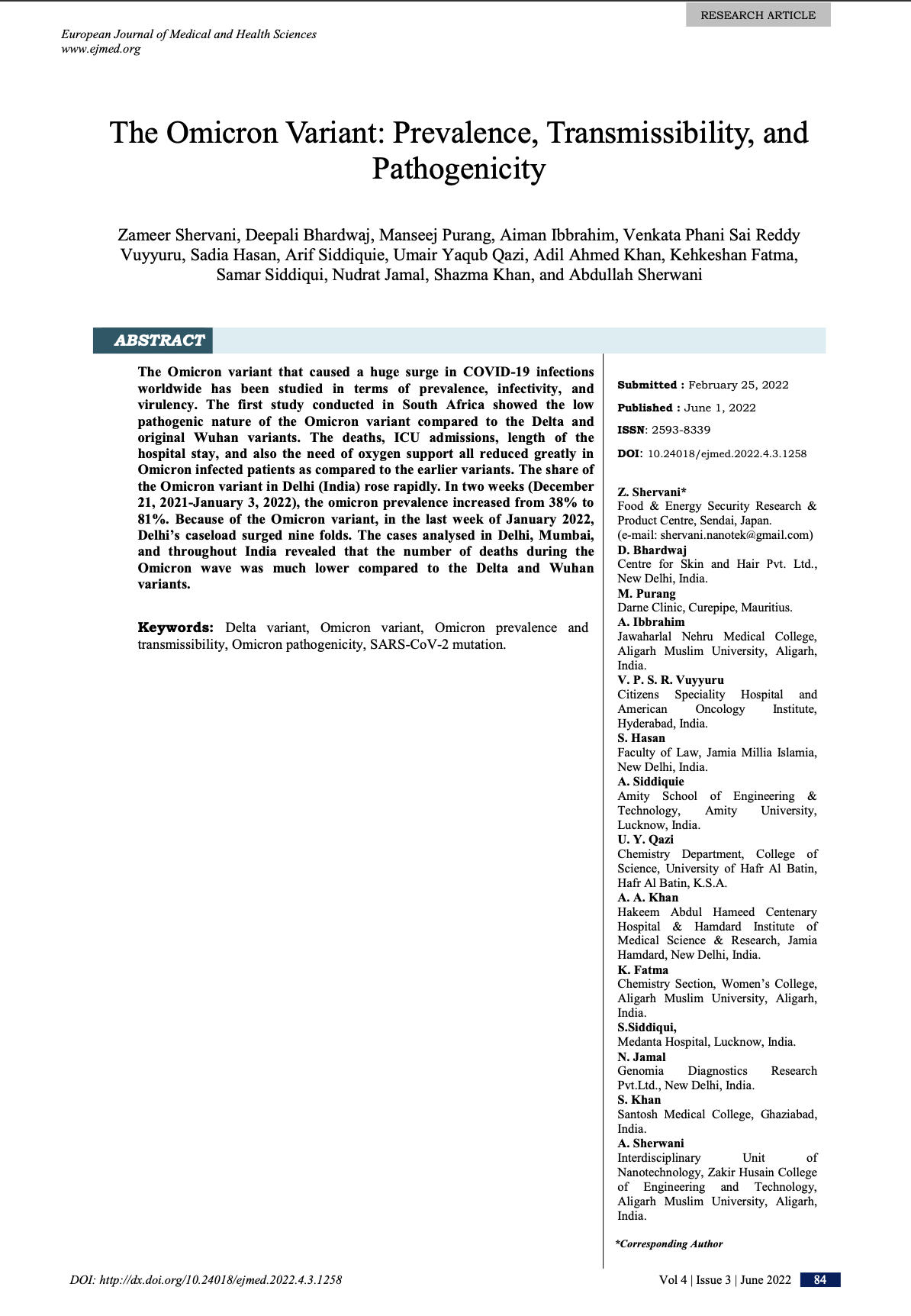 Z. Shervani, D. Bhardwaj, R. Nikhat, A. Ibbrahim, I. Khan, S. Hasan, U. Y. Qazi, A. Agarwal, A. A. Khan, and A. Sherwani, 5th and 6th Sero Survey of Delhi: Vaccine Activated Antibodies Enhancement, European Journal of Medical and Health Sciences, in press.