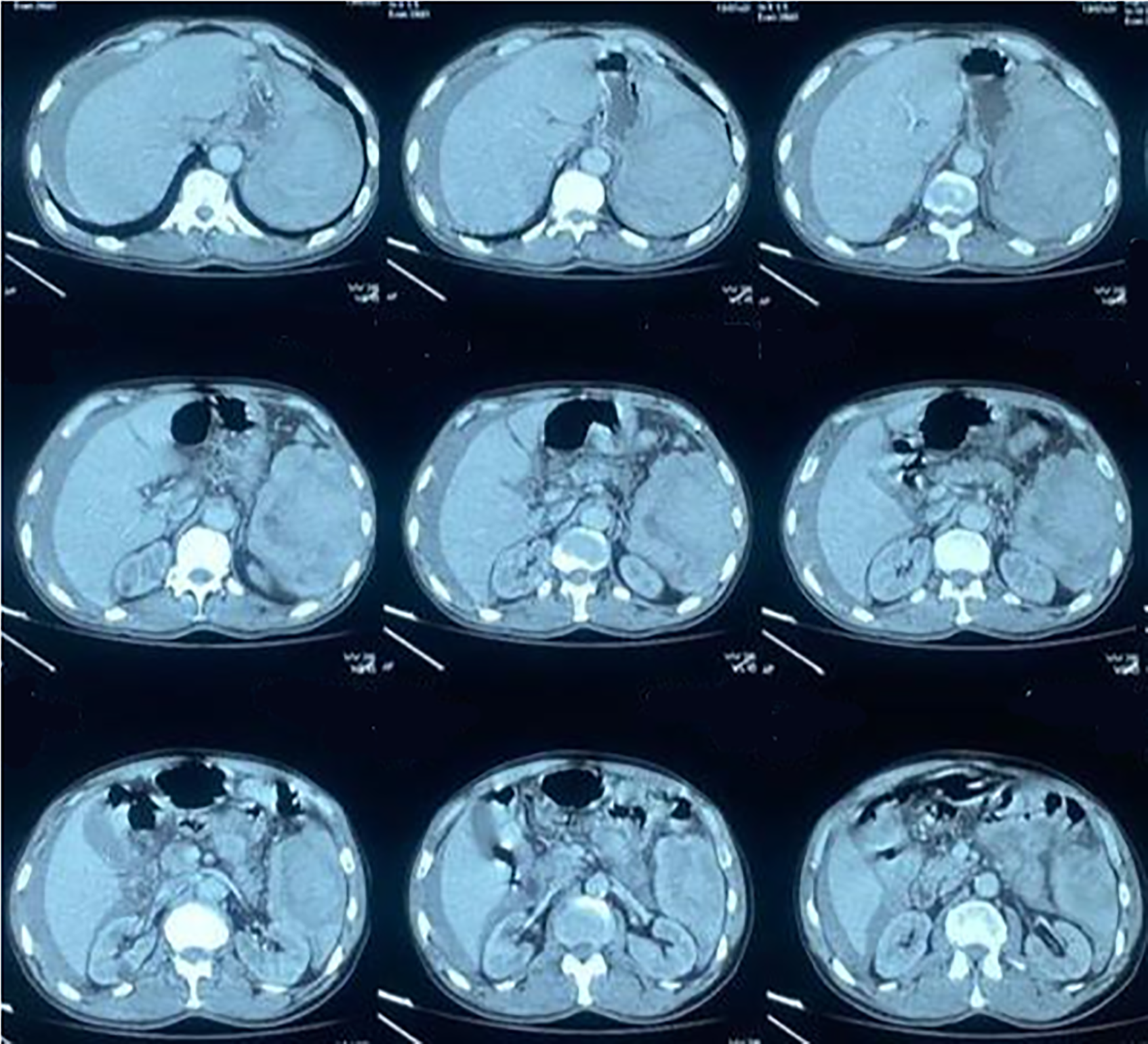 Fig. 1. Abdominal CT showing the ruptured spleen with intraperitoneal effusion.