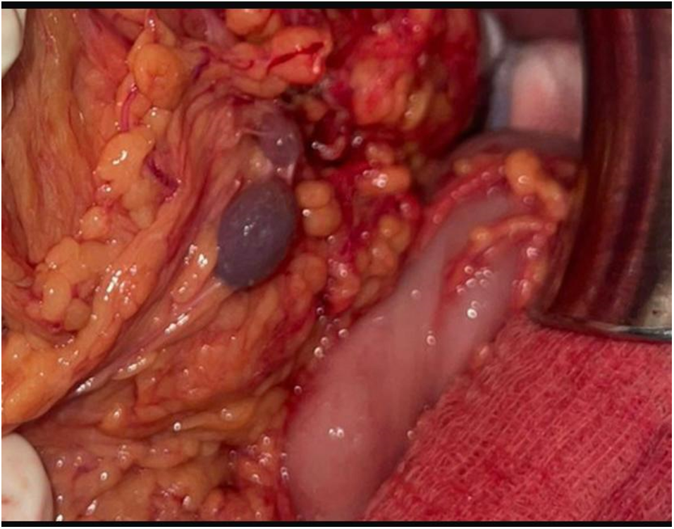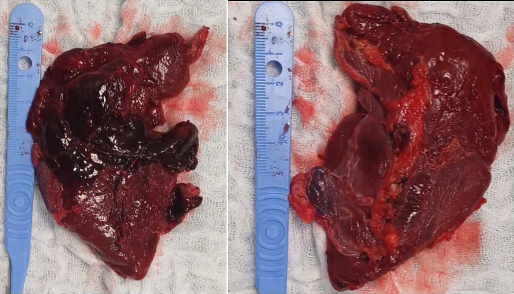 The patient underwent emergency surgery by median laparotomy, in which the exploration showed the presence of an extensive hemoperitoneum, a ruptured spleen on the diaphragmatic surface with active bleeding (Fig. 2) and the presence of two supernumerary spleens in the greater omentum measuring 1 cm and 0.5 cm (Fig. 3) associated with cholelithiasis for which the patient had a splenectomy (Fig. 4) associated with a cholecystectomy and a drainage of the left hypochondrium and sub-hepatic by 2 Salem tubes.