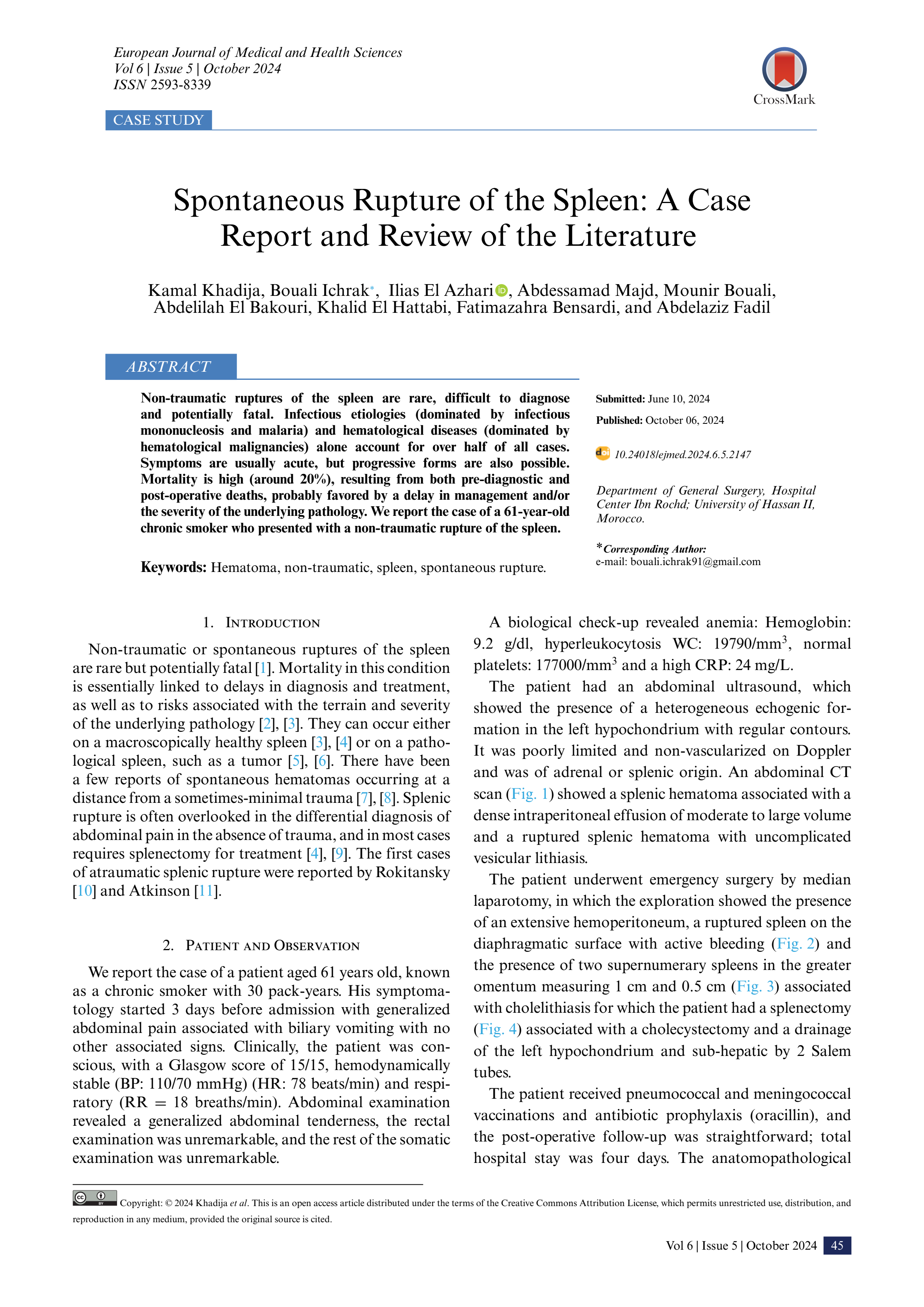 Alyaseen EM, Hantol NA, Alyousef JA, Alanazi BS, Alghamdi R. Spontaneous splenic rupture in a young patient: a comprehensive case report and literature review. Cureus. 2024;16(5):1–6.