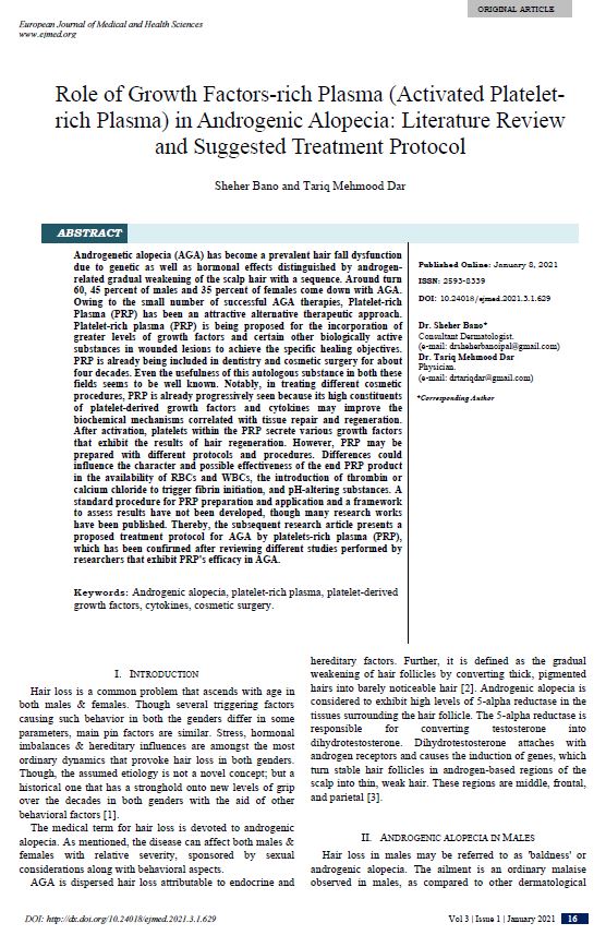 Androgenetic alopecia (AGA) has become a prevalent hair fall dysfunction due to genetic as well as hormonal effects distinguished by androgen-related gradual weakening of the scalp hair with a sequence. Around turn 60, 45 percent of males and 35 percent of females come down with AGA. Owing to the small number of successful AGA therapies, Platelet-rich Plasma (PRP) has been an attractive alternative therapeutic approach. Platelet-rich plasma (PRP) is being proposed for the incorporation of greater levels of growth factors and certain other biologically active substances in wounded lesions to achieve the specific healing objectives. PRP is already being included in dentistry and cosmetic surgery for about four decades. Even the usefulness of this autologous substance in both these fields seems to be well known. Notably, in treating different cosmetic procedures, PRP is already progressively seen because its high constituents of platelet-derived growth factors and cytokines may improve the biochemical mechanisms correlated with tissue repair and regeneration. After activation, platelets within the PRP secrete various growth factors that exhibit the results of hair regeneration. However, PRP may be prepared with different protocols and procedures. Differences could influence the character and possible effectiveness of the end PRP product in the availability of RBCs and WBCs, the introduction of thrombin or calcium chloride to trigger fibrin initiation, and pH-altering substances. A standard procedure for PRP preparation and application and a framework to assess results have not been developed, though many research works have been published. Thereby, the subsequent research article presents a proposed treatment protocol for AGA by platelets-rich plasma (PRP), which has been confirmed after reviewing different studies performed by researchers that exhibit PRP's efficacy in AGA.
