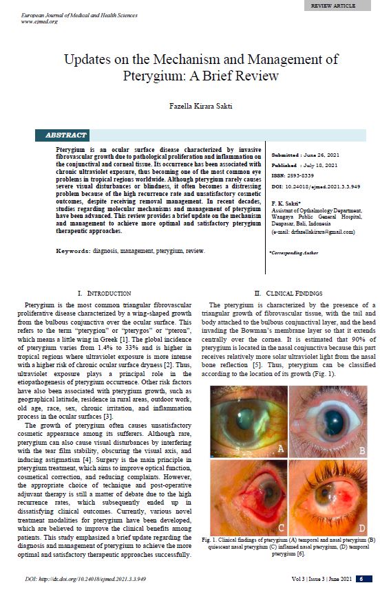 F. Rezvan, M. Khabazkhoob, E. Hooshman, A. Yekta, M. Saatchi, H. Hashemi, “Prevalence and risk factors of pterygium: a systematic review and meta-analysis,” Surv. Ophthalmol., vol. 63, no. 5, pp. 719-735, Sep-Oct 2018.